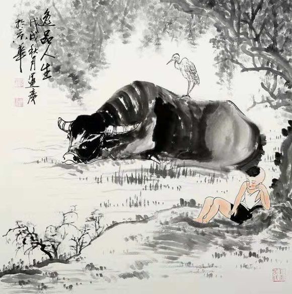 在吴运广的画笔下,牛的形象栩栩如生,既有憨态可掬的温情,又有坚定不屈的力量。他的作品中,牛常常处于悠闲自在的状态,如《逸品人生》中,牛慵懒地卧在地上,眯缝着双眼,惬意安详,鸟儿站在它的身上休息,牧童在旁边酣睡,一片祥和宁静的景象跃然纸上。这种对自然之美的细腻捕捉和生动描绘,令人心生向往。