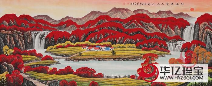 秋山万里,万山红遍,层林尽染,气势磅礴,意境寥廓。一派丰收的喜庆场面,给人一种喜气洋洋的喜庆之感,左右流水飞流而下汇入一处,有着聚宝盆之象。“鸿运千秋”可寓国运兴旺昌隆,福泽千秋万代,  又可意家道运势,聚福纳财,百代兴旺。作为家居装饰画为家居带去好风好水。