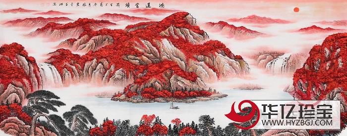 此幅作品《鸿运当头》是李林宏老师的精品之作,他将传统国画山水精髓和中G红色山水画历史特性相结合,构图巧妙,虚实相生,远近呼应,有气势恢宏之势,又有宁静辽远之境,给人一种恢宏宁静的大气之感。在烟云环绕之中,形成微妙的聚宝盆格局,寓意吉祥又不失典雅风范。