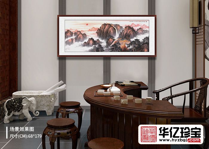 这幅王宁的《旭日东升》作品属于风水画靠山图,画面表现的是巍巍雄伟的泰山,早晨刚刚升起的太阳把远山染成了红色,山水的松树苍劲挺拔,环绕在山间的云雾宛如轻柔的腰带在飘荡,朦朦胧胧,似动非动,更加衬托出泰山的妖娆美丽,画面中石阶而上通往南天门的台阶让人浮想联翩,有步步高升,步步为赢的含义,光明顶是泰山的ZUI高峰,也是十八盘的尽头,经过千辛万苦登上泰山的ZUI高处,有一种“山登绝顶我为峰”的豪放。同时也会想起那句:会当凌绝顶,一览众山小的经典名句。此画的内涵可谓是“仁者见仁智者见智”了。