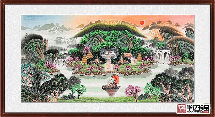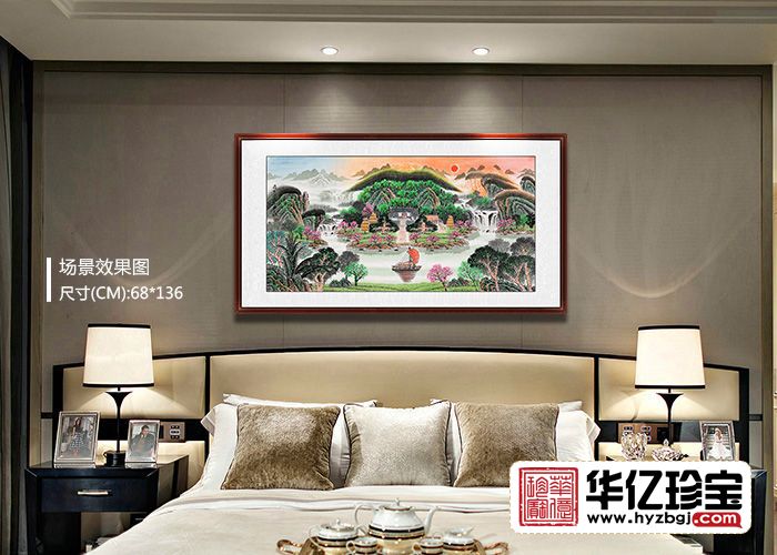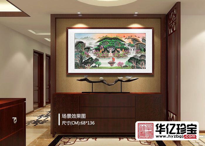 本幅聚宝盆山水画寓意深刻:前有财路,后有靠山;左有招财树,右有挡灾树;财源滚滚;旭日东升,红日当头,象征鸿运当头;山势延绵,壮丽壮观,权威旺盛,功名荣达。本幅作品适合客厅、办公,经商等场所。