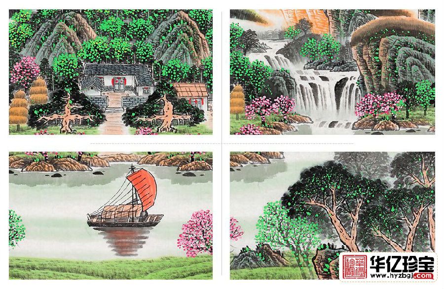 本幅聚宝盆山水画在构图上以环抱之姿寄寓人间祥和,将“山水环抱,藏风聚气”的地理元素有机融入,其前景开阔迎祥纳福,左有招财树,右有摇钱树,整幅作品青山绿水间展现祥和美满、招财聚富的深远意境。