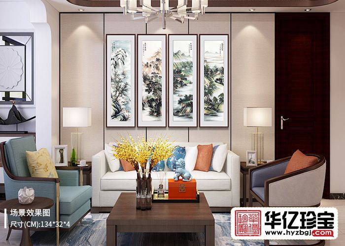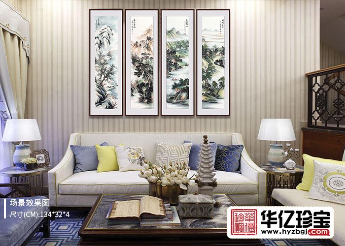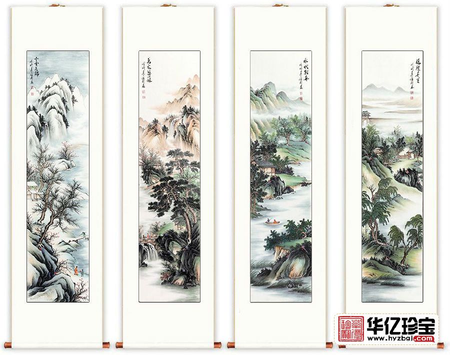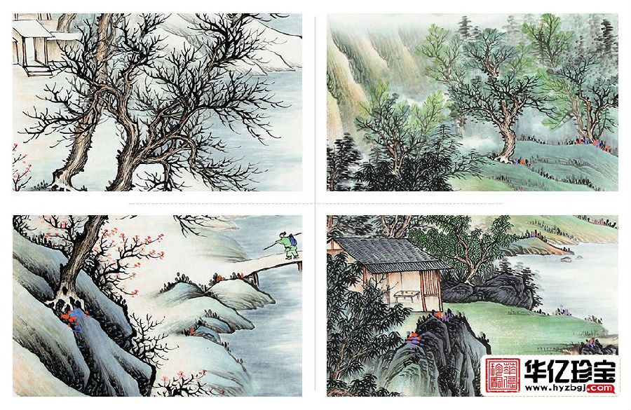 这幅作品无论是技法还是构图,细致到人物和草植,河流,瀑布,四幅画里面没有重复的景色,没有同样姿态的人物,可见是绘画者用心之作。风格高雅脱俗,设色清丽,构图新颖,技法颇多,工整中极见飄逸,经营处极见天机,是张利老师的精品之作。此作可悬挂在客厅、书房、茶楼等地,做为乔迁新居的礼品上档次且彰显品位。