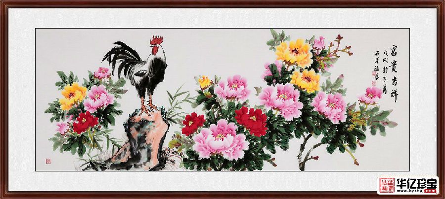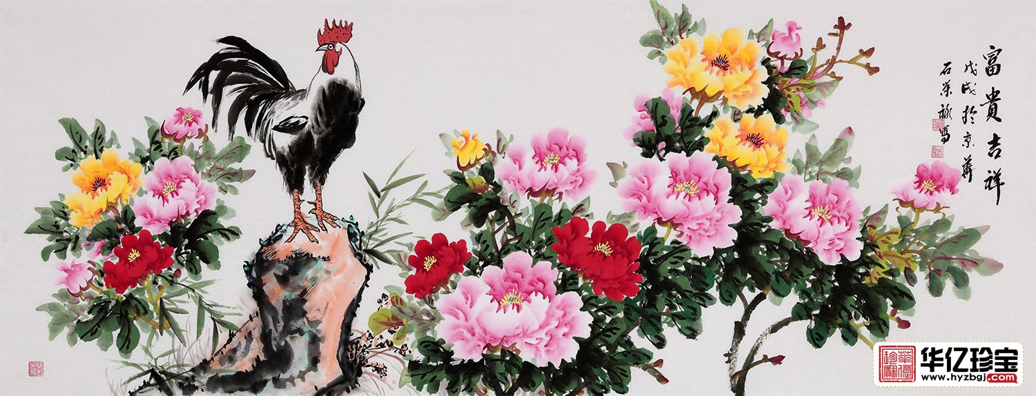 国画牡丹图 石荣禄新品牡丹公鸡图《富贵吉祥》