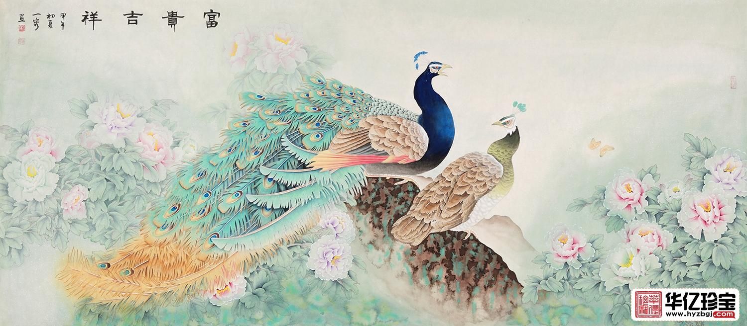 王一容八尺横幅孔雀牡丹图《富贵呈祥》