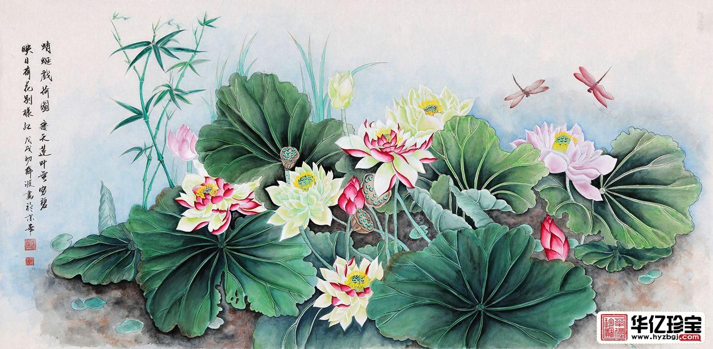 薛波三尺横幅荷花图作品《蜻蜓戏荷图》