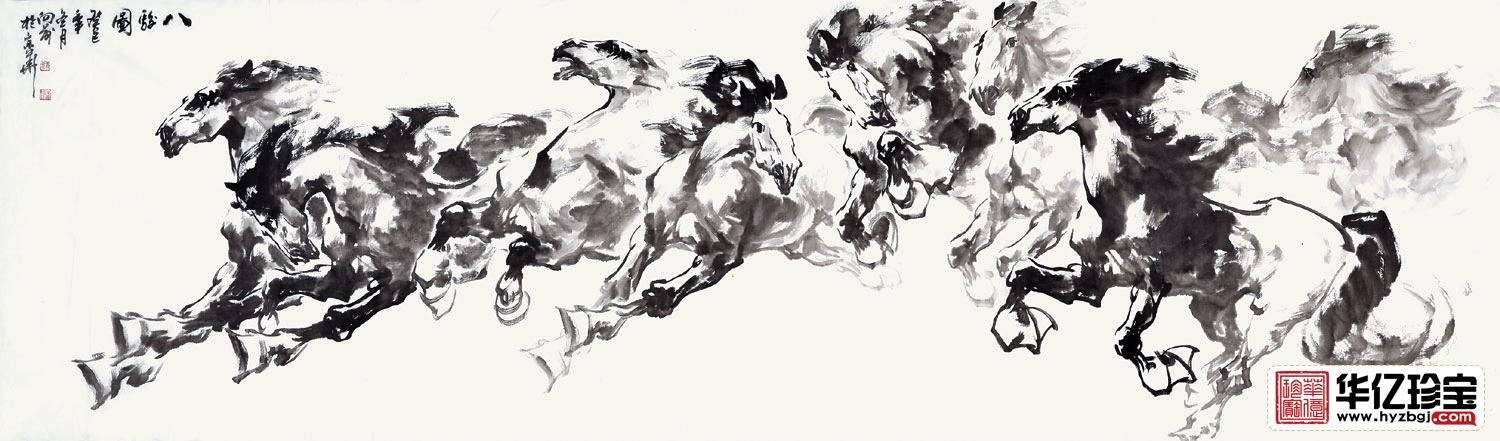 此作品,画的可谓是放荡不羁、酣畅淋漓。泼墨之下,八匹神驹张狂之态显露无遗。有诗云,“胡马大宛名,锋棱瘦骨成。竹批双耳峻,风入四蹄轻。所向无空阔,真堪托死生。骁腾有如此,万里可横行。”诗即是画,画即是诗,八骏如此,八方可行!
