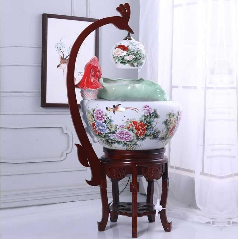 陶瓷鱼缸;木质底座 颜色:白瓷鱼缸,粉彩图案