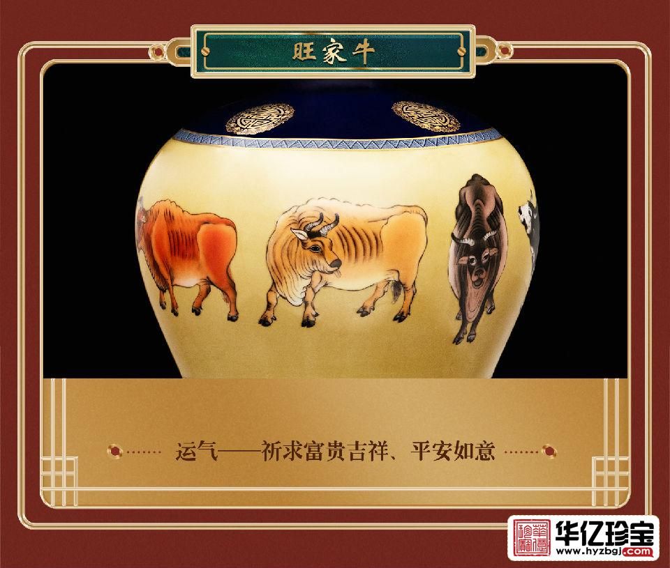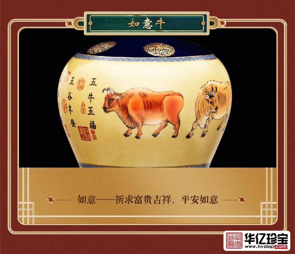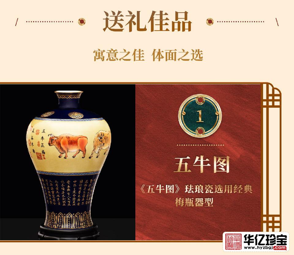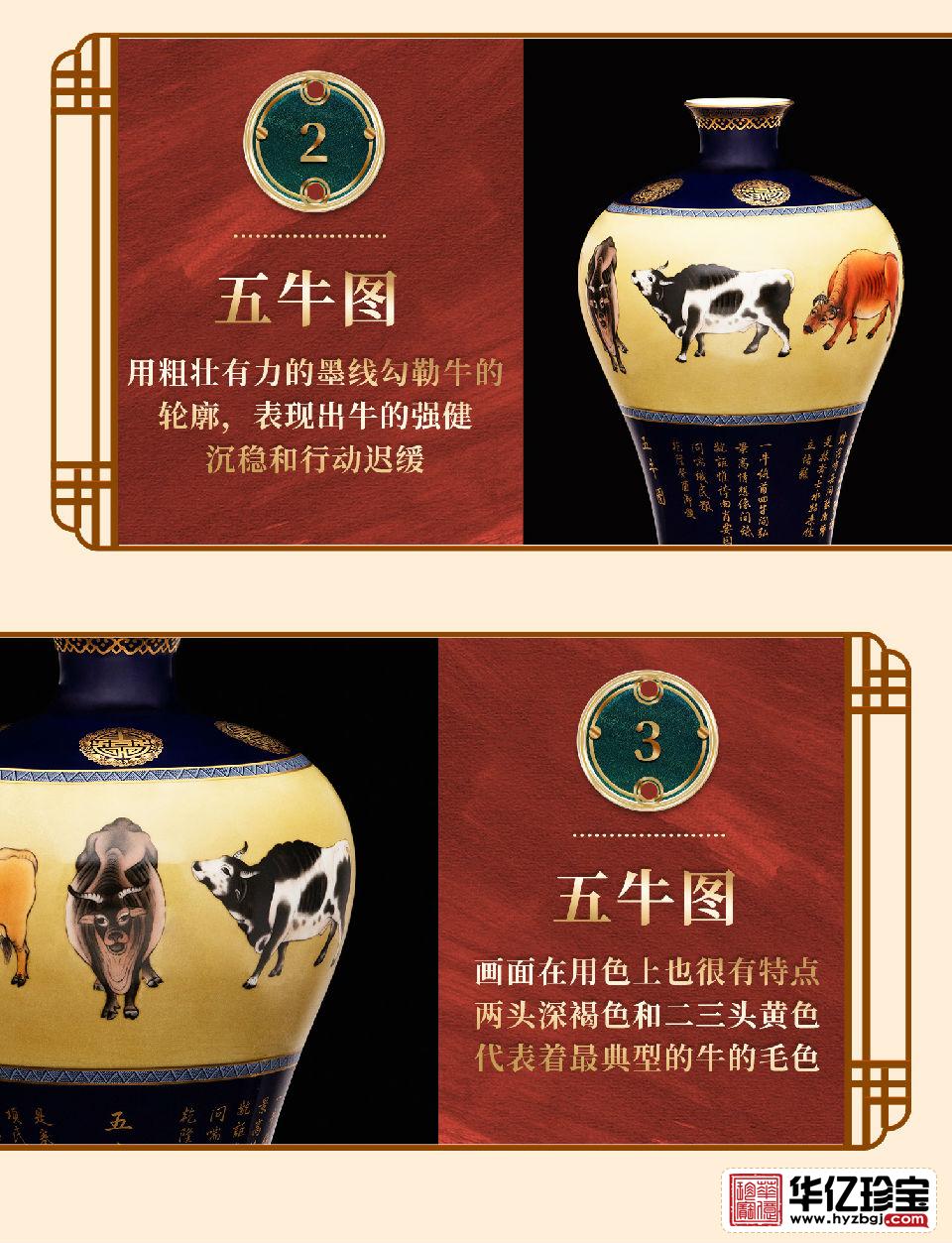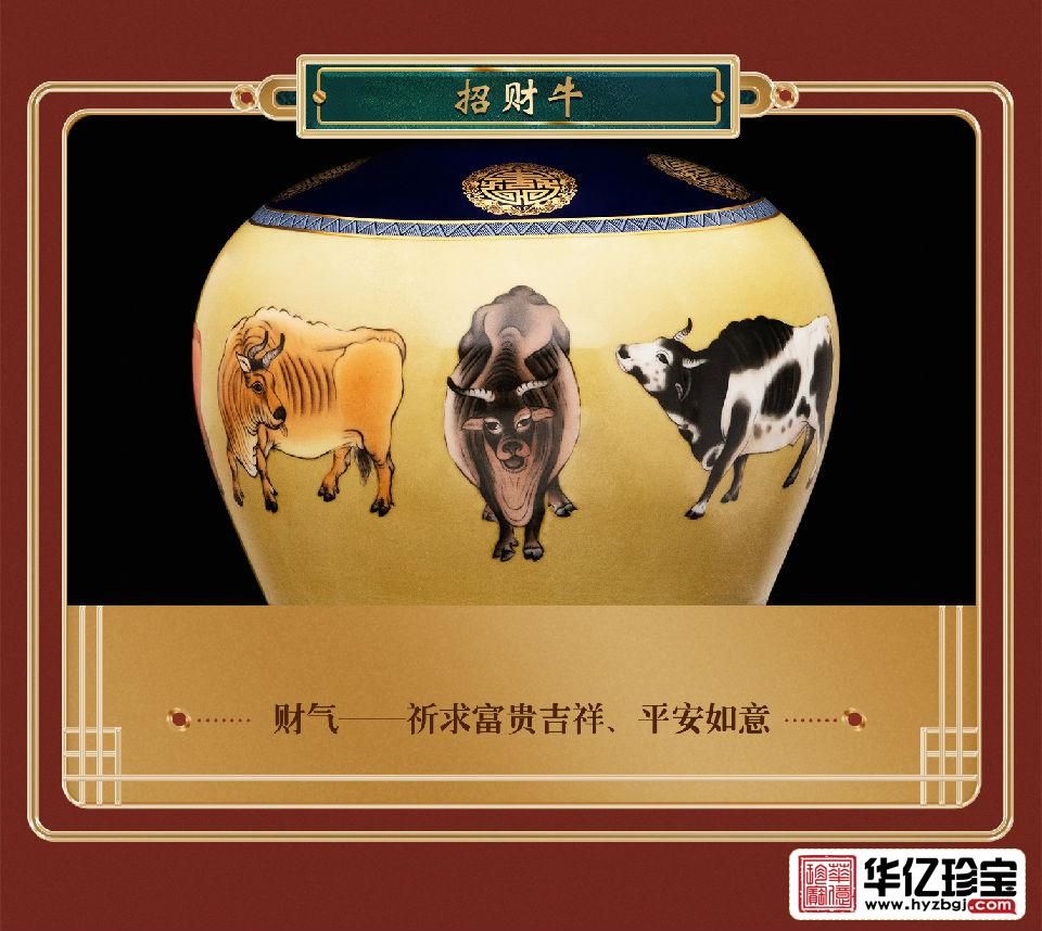为迎接2021年生肖牛年,五牛齐聚,福禄寿喜财,并庆祝2021年中GGCD建党100周年,故宫博物院指定官窑瓷器***人阳士琦特选用中G十大传世名画,故宫博物院镇馆之宝《五牛图》为蓝本融合皇家制瓷技艺,国宝瓷画,创作出《五牛图》珐琅瓷。