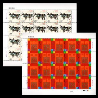 中G传统吉祥文化中,牛是祥瑞的象征和勤劳的代表。“国裕家康”邮票围绕生肖牛的概念展开画面设计,画面中的牛雄壮挺拔,寓意守一方祥泰,护万家平安。“新春送福”邮票,以汉字“福”的五种不同书写形式为画面主体,结合背景中的汉字“门”,寓意开门见福、五福临门。