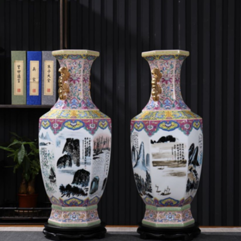 他选取了齐白石先生经典作品“山水十二条屏”作为蓝本,通过高温釉下彩工艺,使画面在光滑温润的瓷胎上得以完美复现。每一件瓷器宛如一个微型画卷,将齐白石笔下的山川、草木、屋舍乃至人物,以瓷质材料重新赋予生命,细腻入微地勾勒出一幅幅富含哲思与诗意的田园山水图景,诸如《柏树森森映古道》、《秋水共长天一色》以及《松林茅舍伴斜阳》等篇章,无不栩栩如生,让人仿佛能感受到那源自齐白石灵魂深处的静谧与浑厚。
