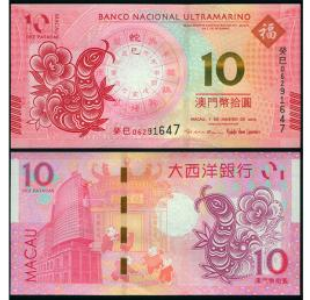 【藏品介绍】为庆祝中国农历新年癸巳生肖蛇年的到来,澳门特区于2013年3月1日发行第2枚生肖纪念钞。大西洋银行已经从去年开始直到2023年结束,将每年发行一枚生肖纪念钞。该枚生肖蛇年纪念钞为澳门生肖钞系列的第二枚,也是2013年蛇年的第一枚新钞。面额10元,纪念钞图案为每年的生肖图案。2013年1月,澳门两家发钞银行将为蛇年发行第二款农历新年10元纸币,以庆祝中国新年。