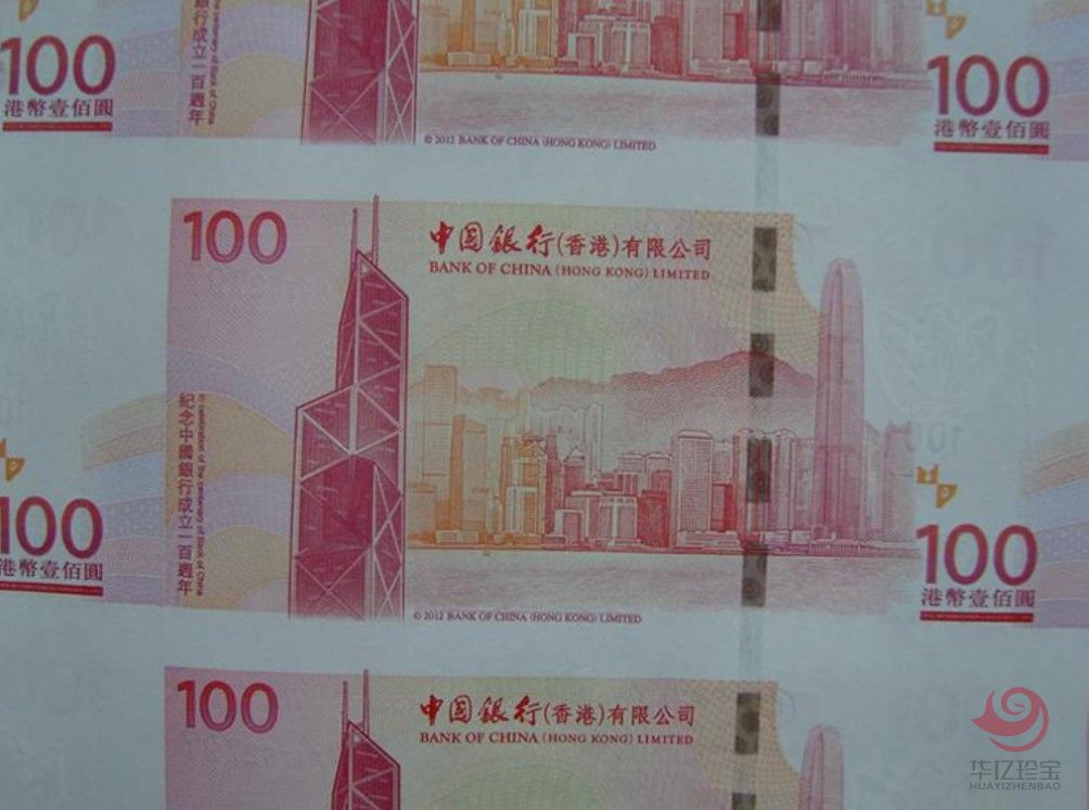中国银行100周年纪念钞三连体(香港),纪念钞面值为港币300元,寓意吉祥、喜庆和激情的红色为主色调。钞票正面以缠绵不断的万里长城和宏伟的北京中国银行大厦为主景,展现历史悠久的中国银行稳健卓越、实力雄厚。钞票背面主景为香港的***金融中心风貌和著名的地表中银大厦。展现中国银行的***化形象,以及为香港的长期繁荣稳定作出贡献,纪念钞图案简洁,色调柔和,雕工细致,极具珍藏价值。
