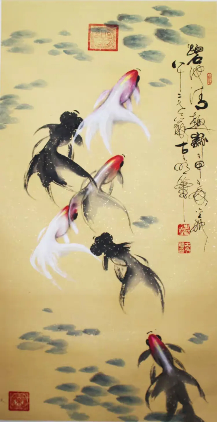 • 此作品《碧池清趣》四尺整张(138×69cm),画中有六条鱼,意在顺顺利利、金玉满堂、旺运生财,非常吉利。金鱼作品是古今明最为擅长的绘画之一。